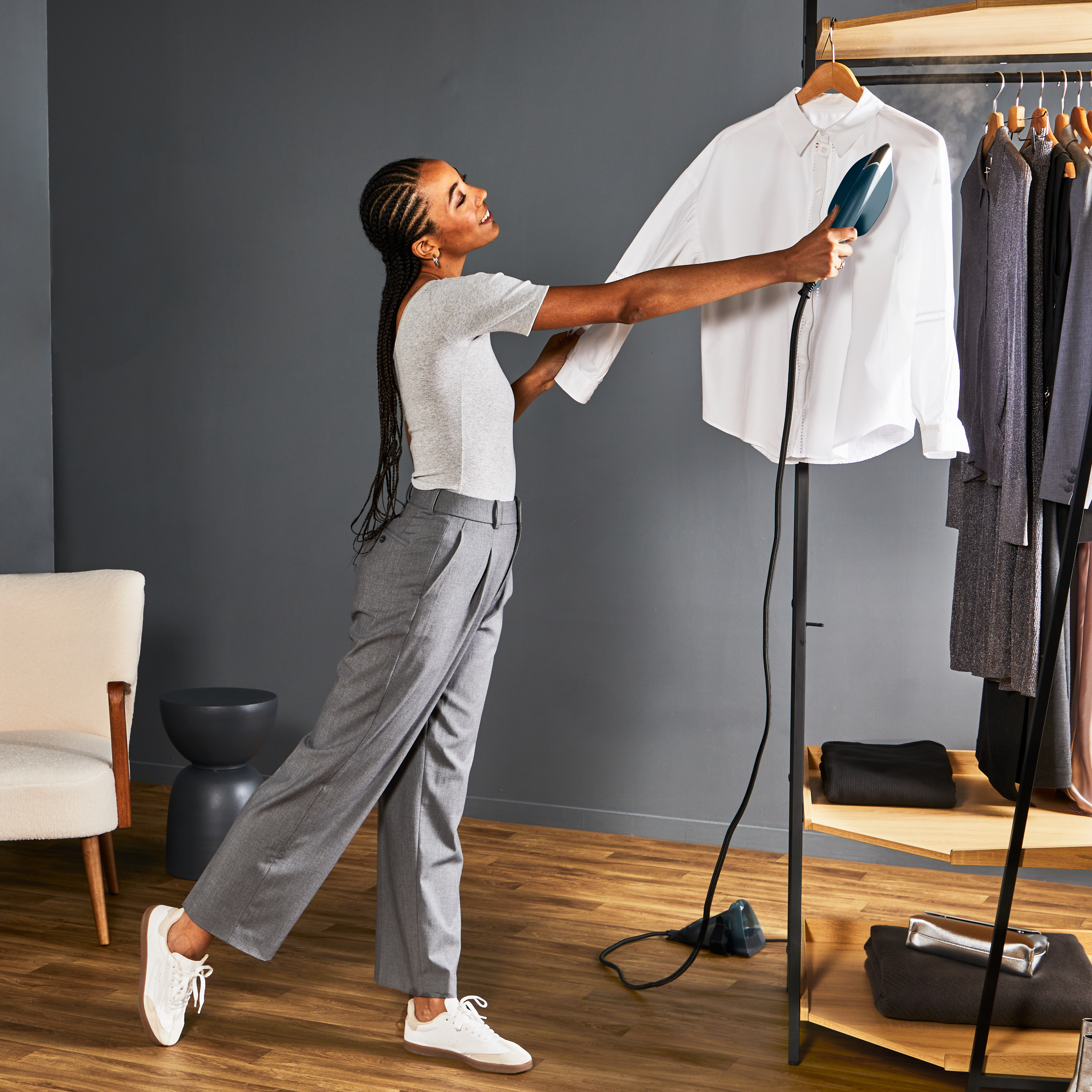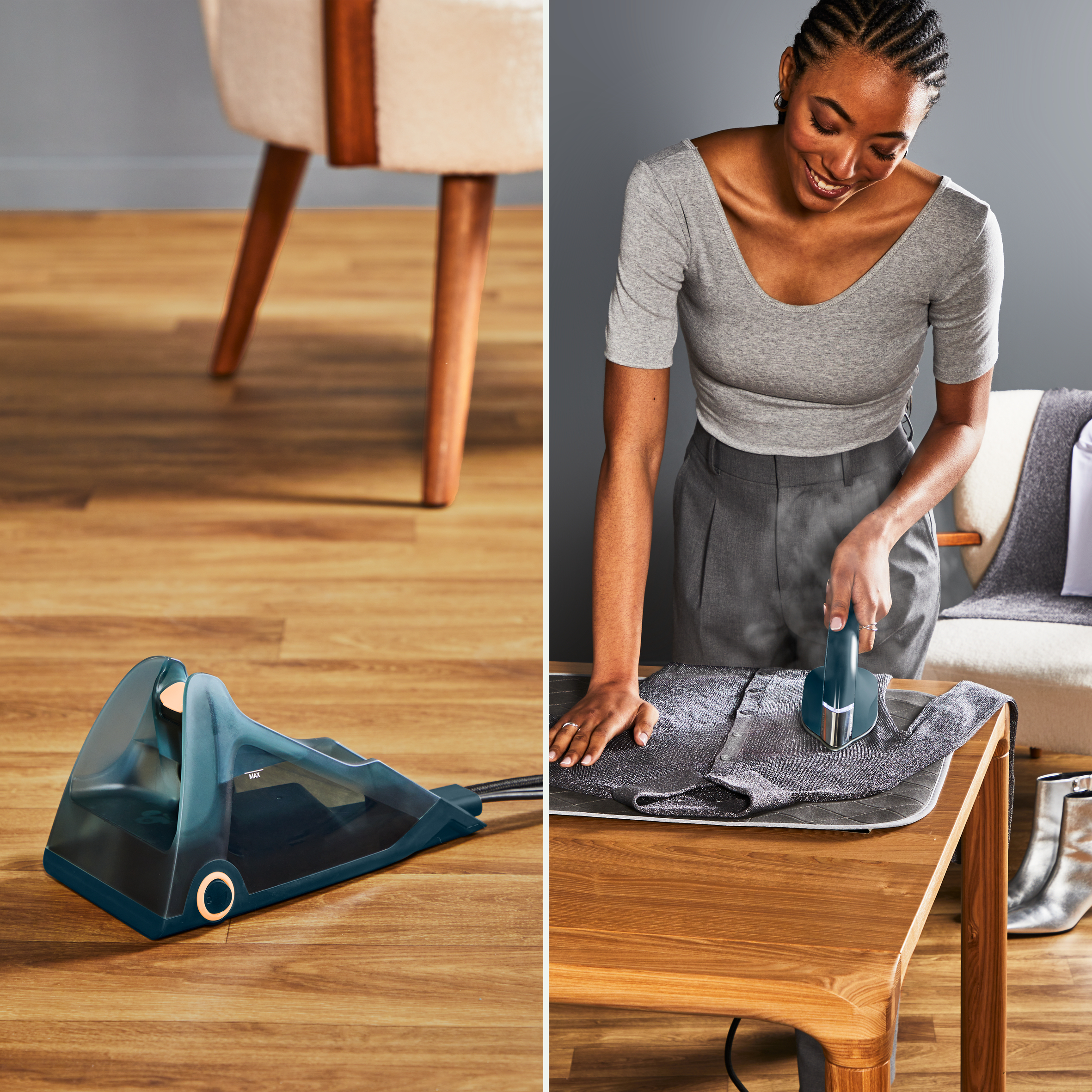 Hızlı dokunuşlar için buharlama ile zorlu kırışıklıkları gidermek için ütüleme arasında sorunsuzca geçiş yapabilen, tüm ihtiyaçlarınızı karşılayan bir giysi bakım çözümü.