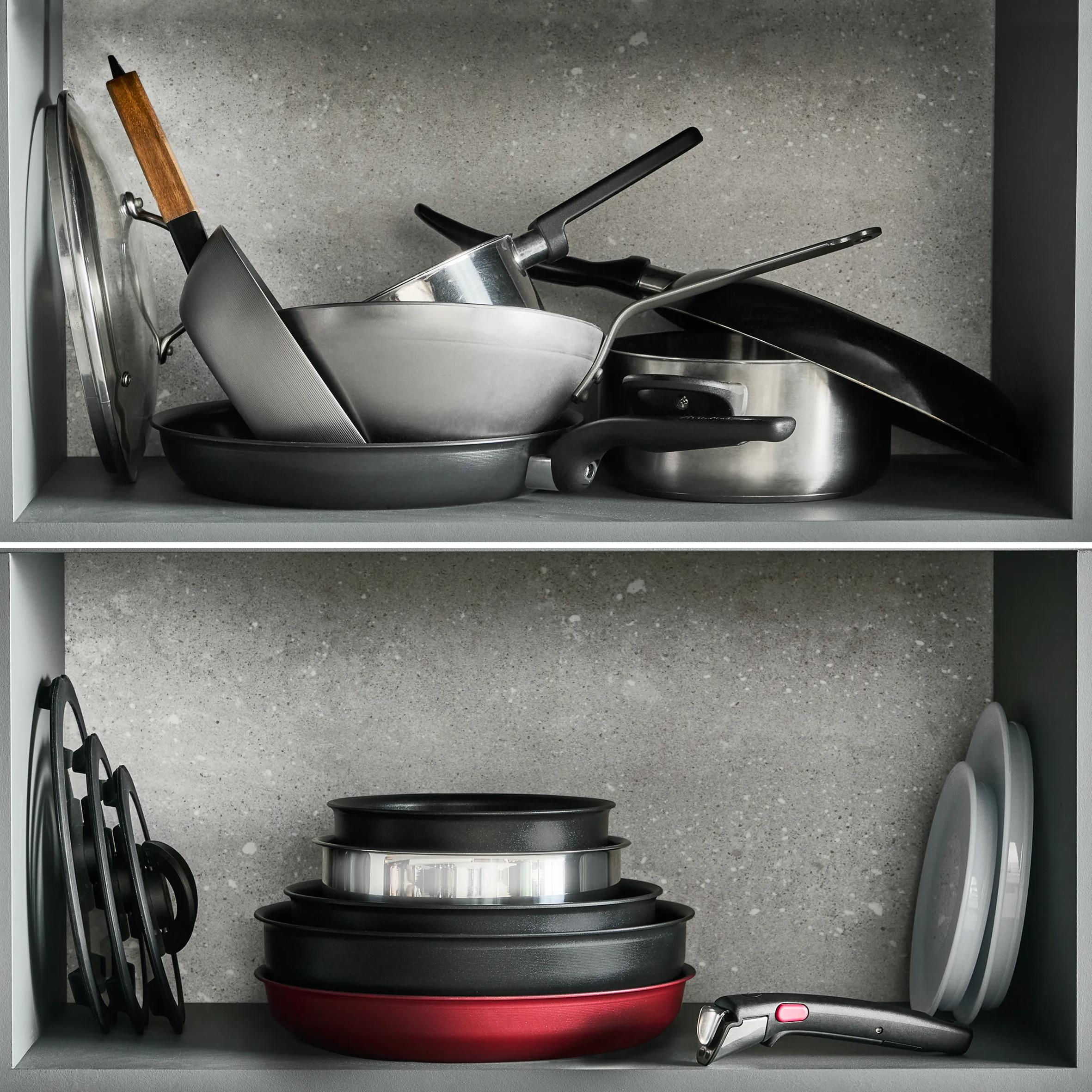 YERDEN TASARRUF: Ultra kompakt ve iç içe geçebilir Ingenio'nun yer tasarrufu sağlayan tavaları, geleneksel tencere ve tavalara göre %70'e kadar daha fazla yer tasarrufu sağlar
