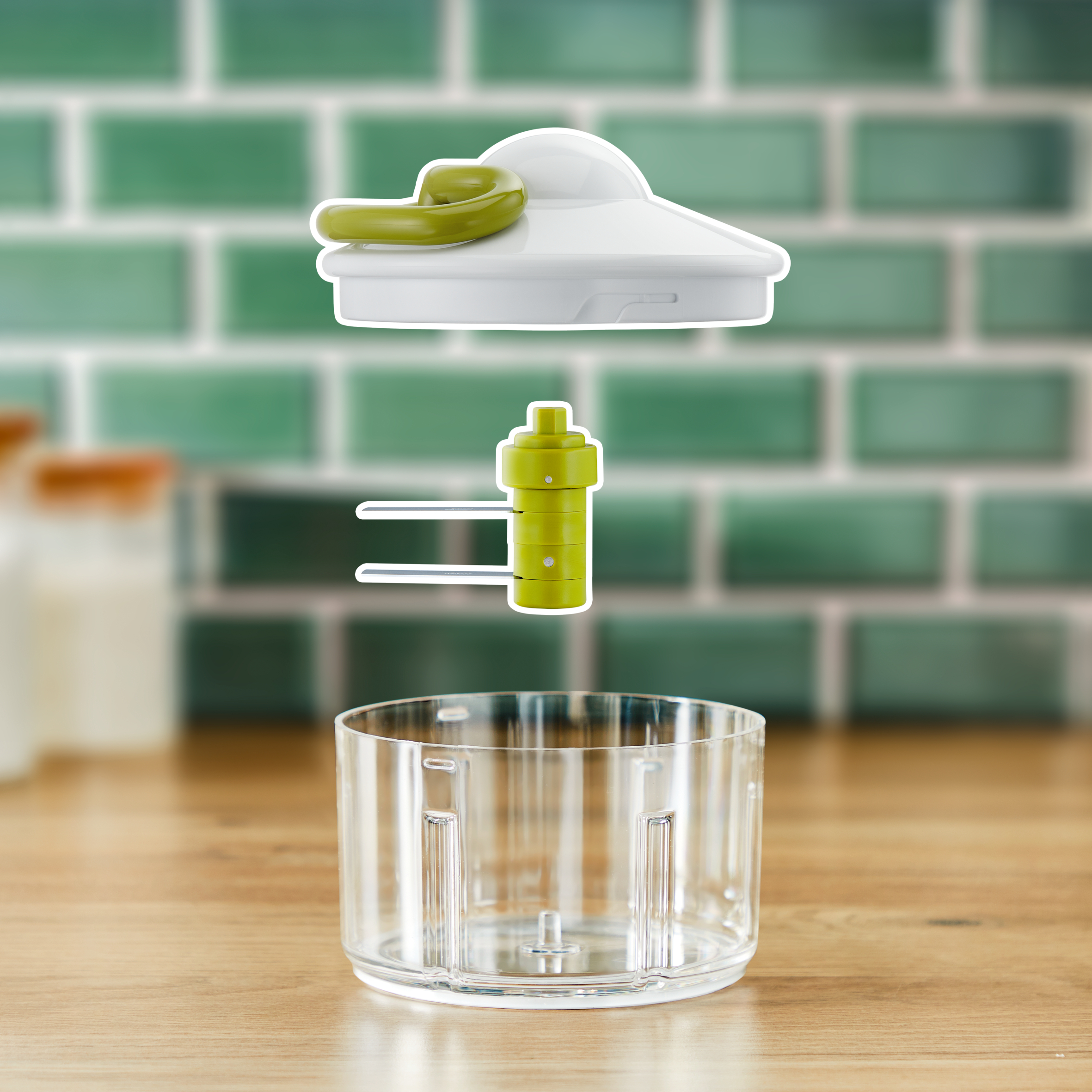Soğan, otlar ve kuruyemişlerden sebzelere kadar bu manuel doğrayıcı, bağımsız paslanmaz çelik bıçaklarıyla kısa sürede zahmetsiz ve kusursuz sonuçlar sunar.