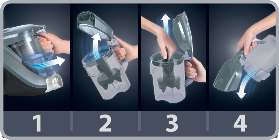 Clean Express sistemi tozun kolayca kontrol edilmesini sağlar. Yalnızca 4 basit hareketle tüm tozlardan kurtulu