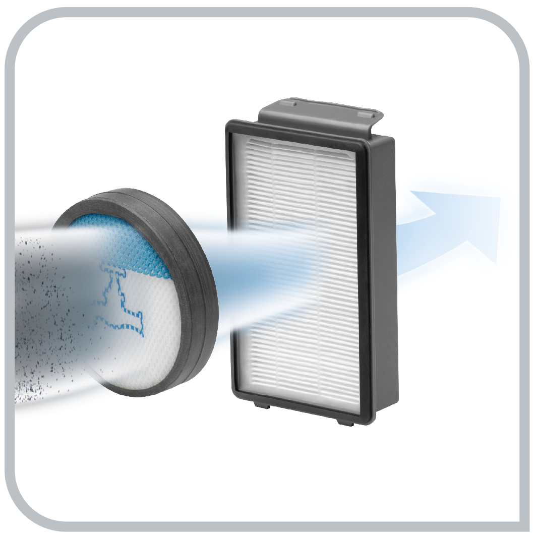 Compact Power™ Cyclonic hava/toz ayrıştırmasında yüksek bir seviyeye ulaşan gelişmiş monosiklonik sistemle donatılmıştır. Üstelik üründe 2 aşamalı filtreleme sistemi mevcuttur. -Motorun önüne yerleştirilmiş köpük filtre -Motor tarafından salınan küçük toz parçacıkları bile yakalaması için hava çıkışının tam önüne yerleştirilmiş özel yüksek verimliliğe sahip filtre. Emilen tozun %99,98'i filtrelenir.